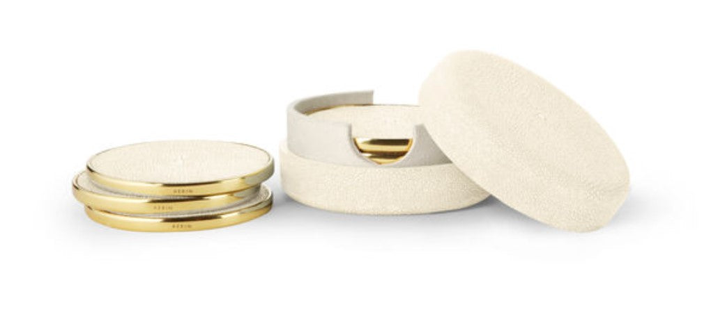 These shagreen-covered coasters with a suede underside are ringed in rich gold-toned brass. Use them to add a touch of glamour to entertaining.
