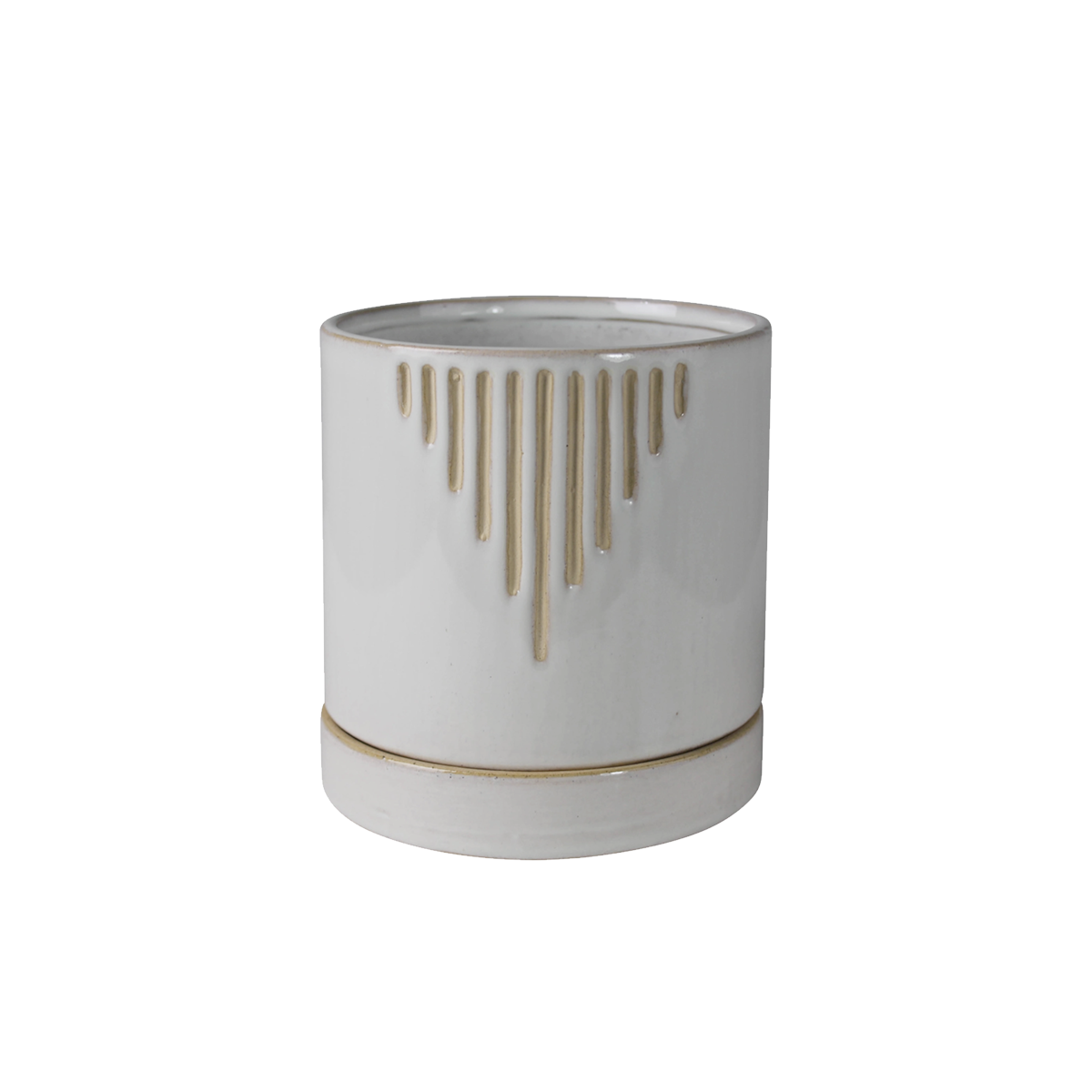 A simple pot and saucer are given a bump up in style with a linear debossed pattern. This pot has a drainage hole and comes with a saucer.