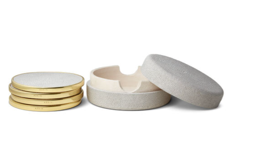 These shagreen-covered coasters with a suede underside are ringed in rich gold-toned brass. Use them to add a touch of glamour to entertaining.