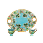 Antique English majolica strawberry serving set by George Jones with custom-fitted cream and sugar containers.