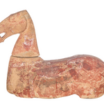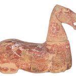 Chinese, Han dynasty (206 BCE?220 CE). Painted, a hollow-sculpted polychrome terracotta statuette, with an opened mouth, depicting the upper body of a naturalistically rendered horse. Archaeological evidence shows that these horses typically were fitted with wood legs which rarely have survived intact