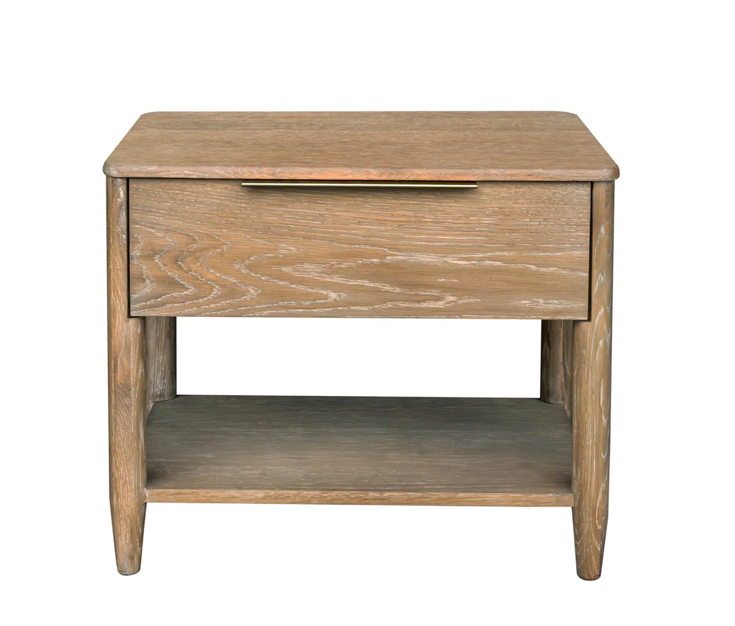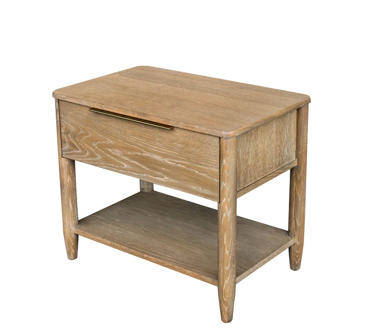 Oak Side Table w/ antique Brass Pull crafted from durable oak for lasting strength, it features a single drawer with a sleek metal handle to keep essentials tucked away. A lower open shelf offers space for books or decor